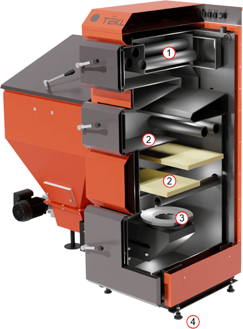 Jedopaleniskowy kocioł stalowy z trwałym żeliwnym palnikiem retortowym. W automatycznym trybie pracy kotła opał podawany jest z zasobnika do palnika retortowego przez podajnik ślimakowy z zasobnika. Wymiennik kotła wykonany jest z atestowanej stali kotłowej o grubości 8 mm.